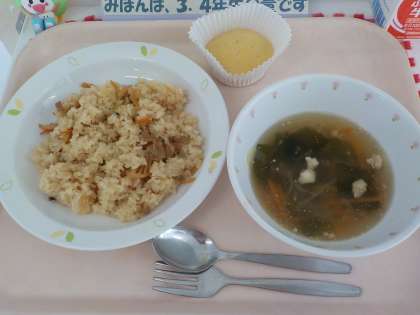 本日の給食は、中華おこわ(端午の節句メニュー)・中華スープ・マーラーカオ・牛乳です。