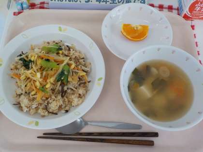 本日の給食は、ビビンバ・わかめスープ・セミノール・牛乳です。