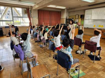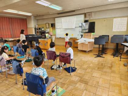 カスタネットを使いリズムうちの学習をしました。子どもたちが、リズムを考えて発表しています。指先まできれいに伸ばして、手をあげています。とても素敵な姿です。