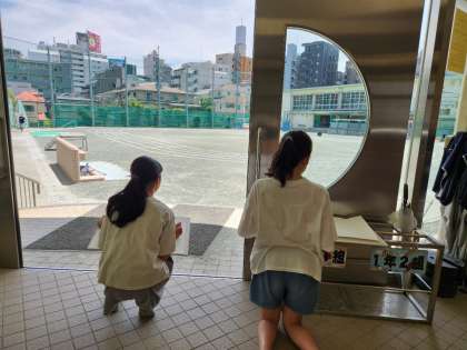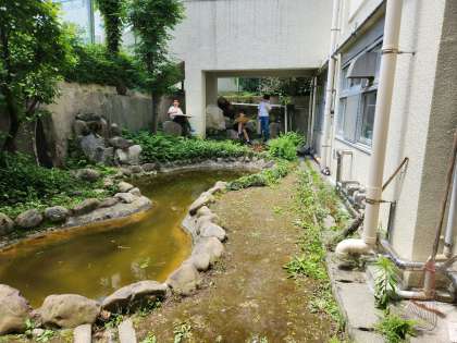 児童昇降口から見える景色、池のある景色、6年生の教室などです。