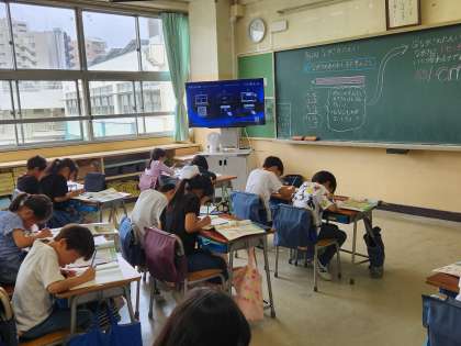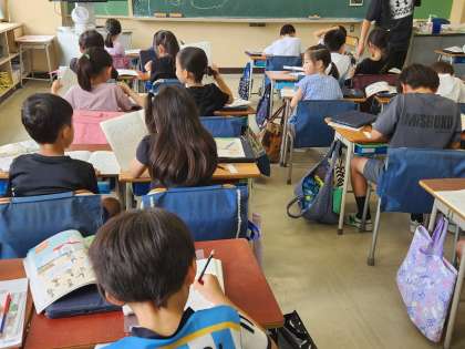 長さの学習です。単位の書き方を学んでいます。ペアで互いの書き方を確かめています。