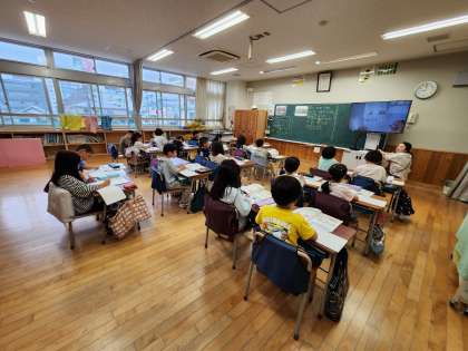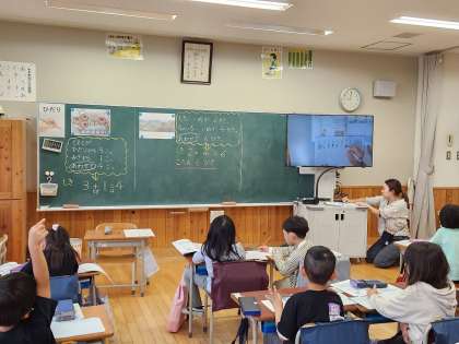 大型テレビで、ノートや教科書を写し出しながら今何をするのかを示しています。