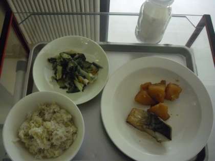 今日の献立は、雑穀ごはん、牛乳、魚の塩焼き、じゃがいもの甘辛煮、和風サラダです。