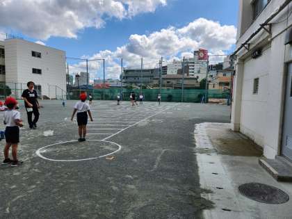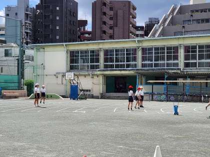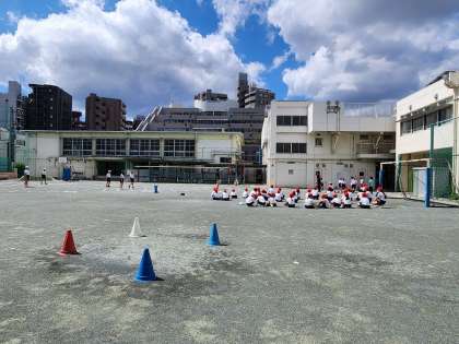今日の午前中は、全校で体力テストをおこなっています。たてわり班で、テスト場所を回ります。