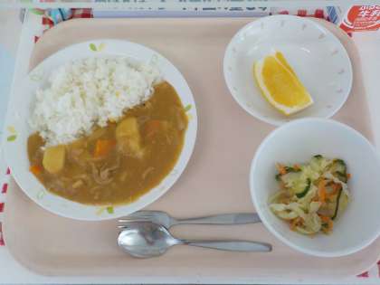 本日の給食は、三宿カレーライス・フレンチサラダ・河内晩柑・牛乳です。