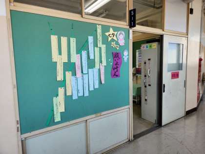 七夕に向けて、5年生、6年生が願い事を短冊に書いて、廊下に貼り出しました。