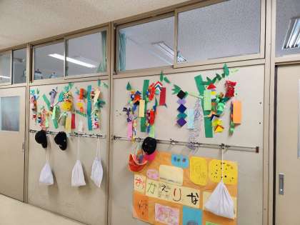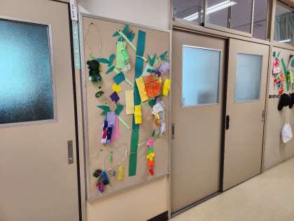 わかば学級の廊下掲示板にたなばた飾りがあります。