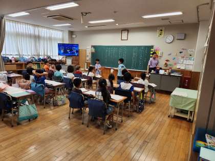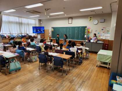 国語の学習で、会話の話形を学び、答え方の学習をペアで行なっています。