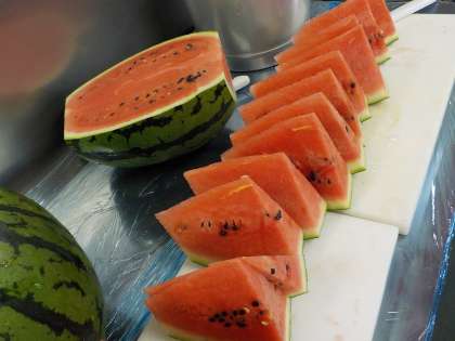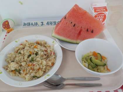 本日の給食は、ガパオ風ライス・やさいのレモンドレッシング・大玉すいか・牛乳です。