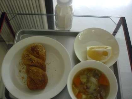 今日は、子どもたちの大好きな揚げパンが出ています。子どもたちは、朝から楽しみにしていました。献立は揚げパン、牛乳、白インゲンの田舎風スープ、ジューシーフルーツです。