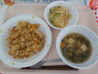 本日の給食は、キムチチャーハン・春雨サラダ・わかめスープ・牛乳です。