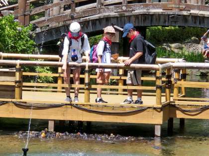 日光江戸村体験、見学中です。鯉にエサやり中です。