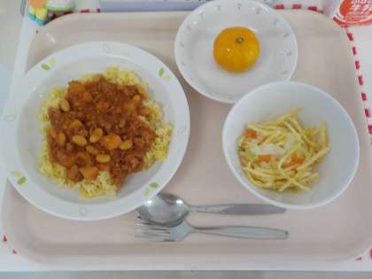 本日の給食は、チリビーンズライス・じゃがいものハニーサラダ・冷凍みかん・牛乳です。