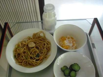 今日の献立は、五目焼きそば、きゅうりの甘酢かけ、フルーツヨーグルト、牛乳です。