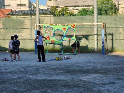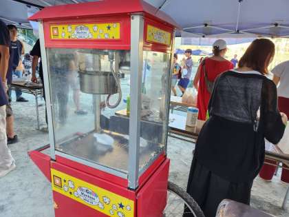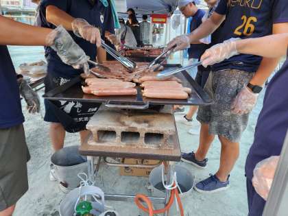 おやつになるフランクフルトやポップコーン、アイスクリームを頬張りながら楽しくたべていました。気温が高い本日ですが、「三宿小 おやじの会」の皆様がフランクフルトを焼いてくださっています。