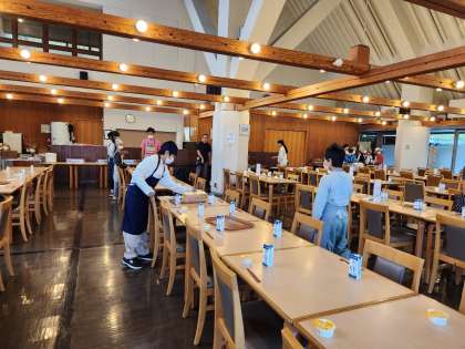 3日目の朝の準備もで手際よくできています。食事係の皆さんありがとうございました。