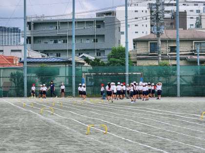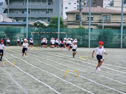 校庭で、2クラス合同でミニハードルを使い、障害物の飛び越し方を学習しました。