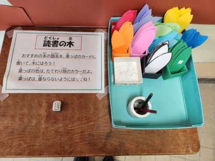 昨年度は、多くのカードが貼られて途中から木を大きくしました。今年は昨年度より大きめの木を用意しました。2日目ですが、すでに貼られています。