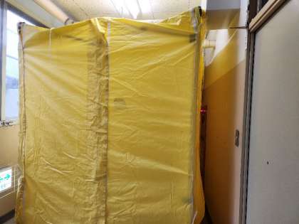 体験中です。煙がこの中はいっています。前がよく見えないなかを姿勢を低くして、壁を触りながら避難します。