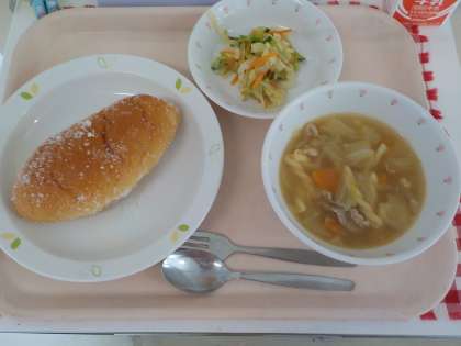 本日の給食は、揚げパン・フレンチサラダ・マカロニスープ(おはなし給食)・牛乳です。