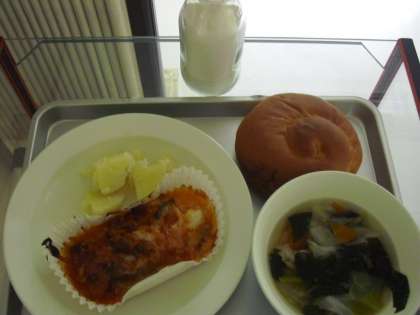 今日の献立は、ミルクパン、魚のピザ風、粉ふきいも、野菜スープです。