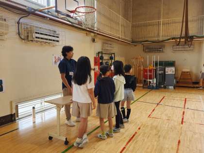 午前中に学年別で活動します。7名のALT の方々が、3年生から5年生の子どもたちと英語だけの会話で活動します。