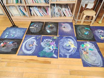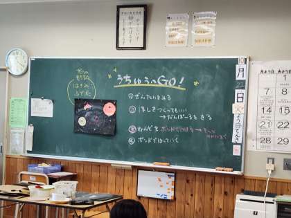 図工です。粘土で形を作ったり、画用紙や段ボールで星を作りました。「うちゅうへGO」の完成です。