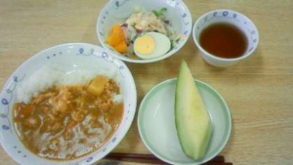 夕飯はカレーライス 野菜サラダ メロンです。たくさん食べます。