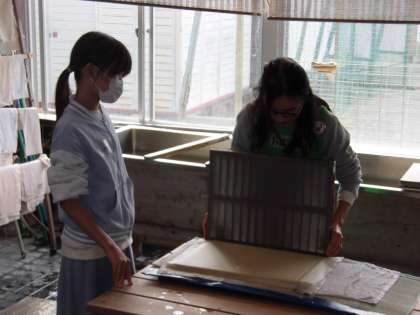 山崎小学校の伝統工芸室の方々のご指導のもと、紙漉きを行い、そん後の作業もしていただき和紙の完成となります。今年もお世話になりました。ありがとうございました。