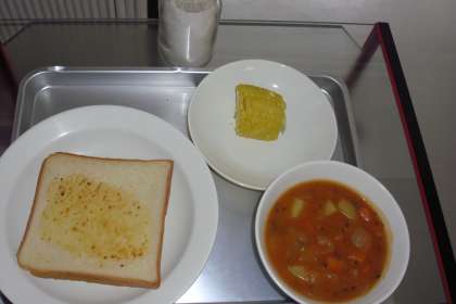今日の献立はガーリックトースト、ハンガリアンシチュー、蒸しとうもろこし、牛乳です。