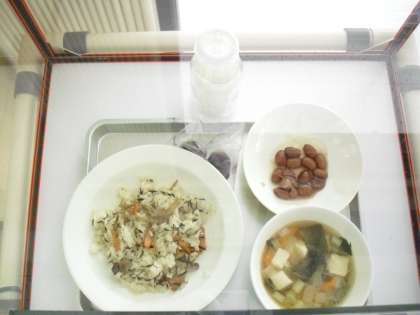 今日の献立は、ひじきごはん、みそ汁、煮豆、冷凍巨峰、牛乳です。