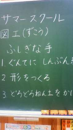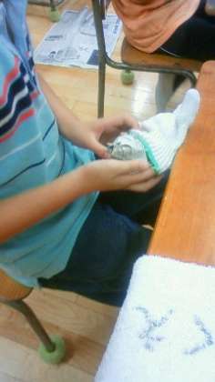 わかば学級高学年のサマースクールは、図工です。軍手に新聞紙をつめます。形ができました。