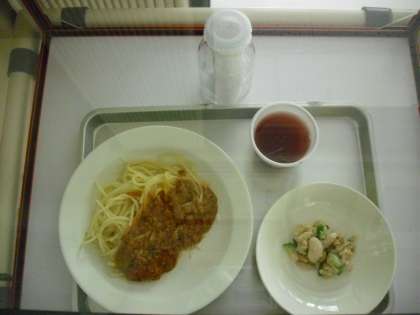 今日の献立は、スパゲッティミートソース、牛乳、ビーンズサラダ、ぶどうゼリーです。