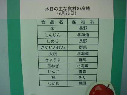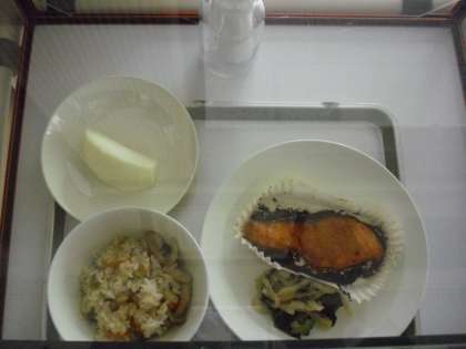 今日の献立はしめじごはん、牛乳、魚のみそマヨネーズ焼き、わかめサラダ、くだものです。