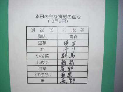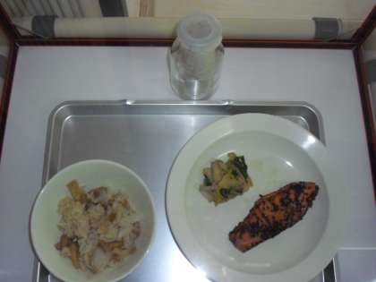 今日の献立は、里芋ごはん、牛乳、鮭の南部焼き、きのこ入り煮びたしです。