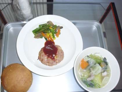 今日の献立は、セサミパン、アップルチーズ、いんげんソテー、ベーコンと野菜のスープです。