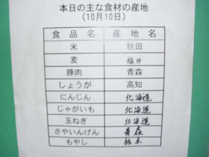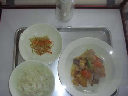 今日の献立は、ごはん、牛乳、じゃがいものそぼろ煮、もやしのカレーじょうゆかけです。