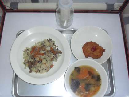 今日の献立は、ひじきご飯、牛乳、豆腐のナゲット、みそ汁です。