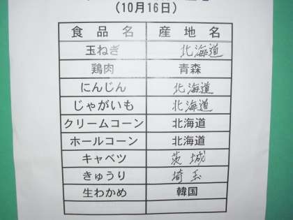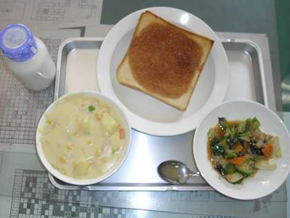 今日の献立は、シナモントースト、牛乳、コーンシチュー、わかめサラダです。