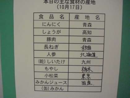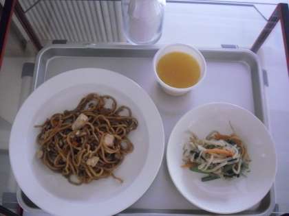 今日の献立は、麻婆豆腐焼きそば、牛乳、ナムル、みかんゼリーです。