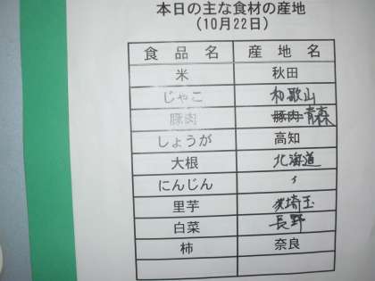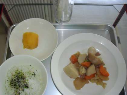 今日の献立は、ごはん、ふりかけ、牛乳、豚肉と大根のうま煮、かきです。