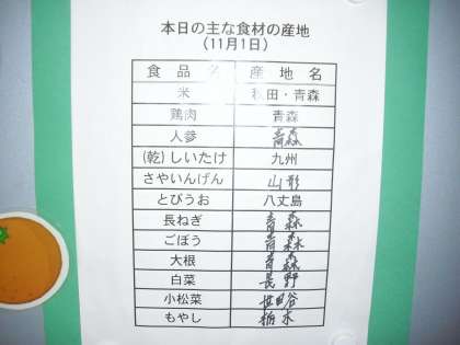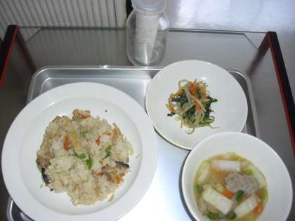 今日の献立は、とりめし、とびうおのつみれ汁、野菜のごまだれかけです。