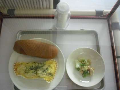 今日の献立は、コーヒーパン、牛乳フレンチエッグ、ビーンズサラダです。