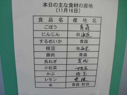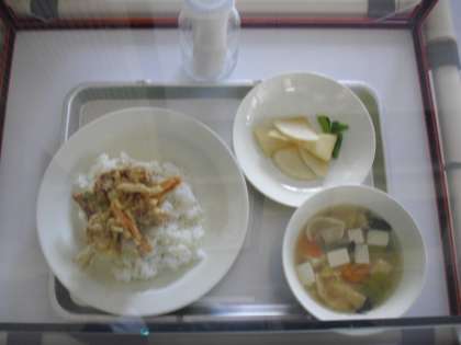 今日の献立は、かき揚げ丼、牛乳、豆腐汁、かぶのレモン醤油かけです。