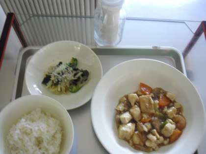 今日の献立は、ごはん、牛乳、豆腐の五目炒め、じゃこサラダです。