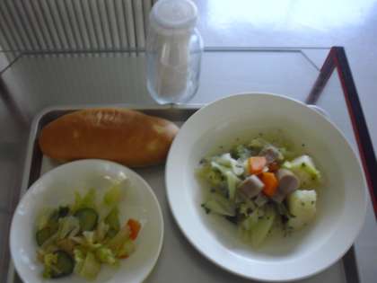 今日の献立は、パインパン、牛乳、ポトフ、野菜のイタリアンドレッシングかけです。