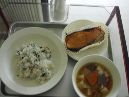 今日の献立は、わかめごはん、牛乳、さけのみそマヨネーズ焼き、けんちん汁です。