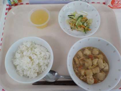 本日の給食は、麦ごはん・ジャージャン豆腐・中華サラダ・りんごゼリー・牛乳です。