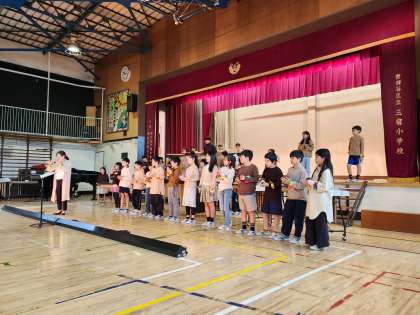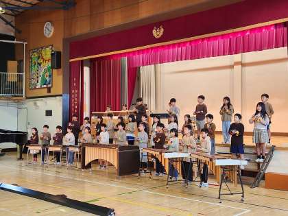 スペインでのカスタネットのたたき方を学び演奏しました。演目の前に、全校で児童の前でカスタネットのたたき方を披露しました。