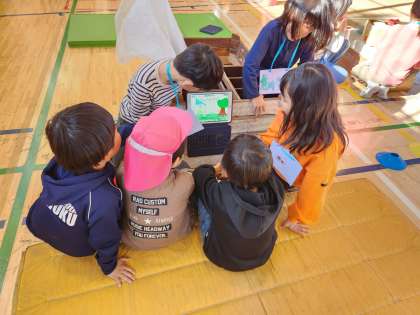 2年生が、タブレットを使い、遊び方を説明しています。絵を書いたものを順番にみせています。